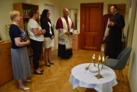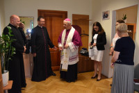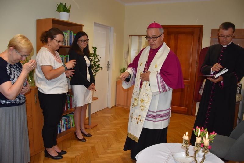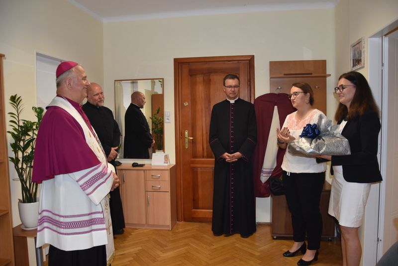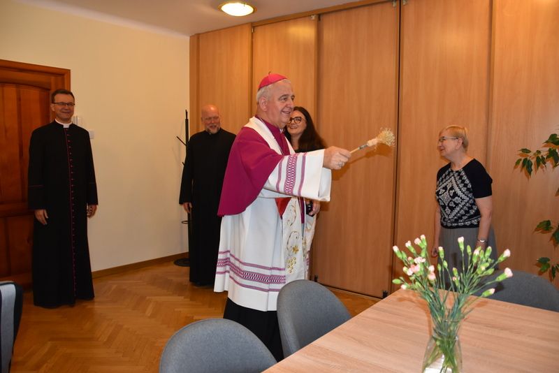 Biskup Kielecki Jan Piotrowski dokonał uroczystego poświęcenia pomieszczeń Wydziału ds. Małżeństw i Rodzin Kurii Diecezjalnej oraz Diecezjalnego Studium Życia Rodzinnego. Wydarzenie miało miejsce 3 września 2025 r. w godzinach popołudniowych z udziałem Ks. Dyrektora Wydziału Finansowego kieleckiej Kurii i pracowników Duszpasterstwa Rodzin. Pasterz Kościoła kieleckiego w słowie wprowadzającym do modlitwy zwrócił uwagę na szczególne posłannictwo osób świeckich na rzecz małżeństw i rodzin, zwłaszcza w ramach Poradnictwa Rodzinnego. Dziękując za to zaangażowanie i wypełnianie misji udzielonej przez Kościół na mocy decyzji Biskupa diecezjalnego zachęcał, by nie ustawać w gorliwości mimo czasem braku zrozumienia orędzia ewangelicznego ze strony świata. W imieniu personelu Wydziału Duszpasterstwa Rodzin, Ewa Strojwąs, Diecezjalna Doradczyni Życia Rodzinnego podziękowała Księdzu Biskupowi za nieustanne wsparcie, stałe interesowanie poczynaniami i decyzje służące skuteczniejszemu realizowaniu zadań tej części misji Kościoła. Podziękowania zostały też skierowane również pod adresem Ks. Dyrektora Adriana Buczkowskiego za wspieranie radami i decyzjami spraw organizacyjnych i administracyjnych Duszpasterstwa Rodzin.