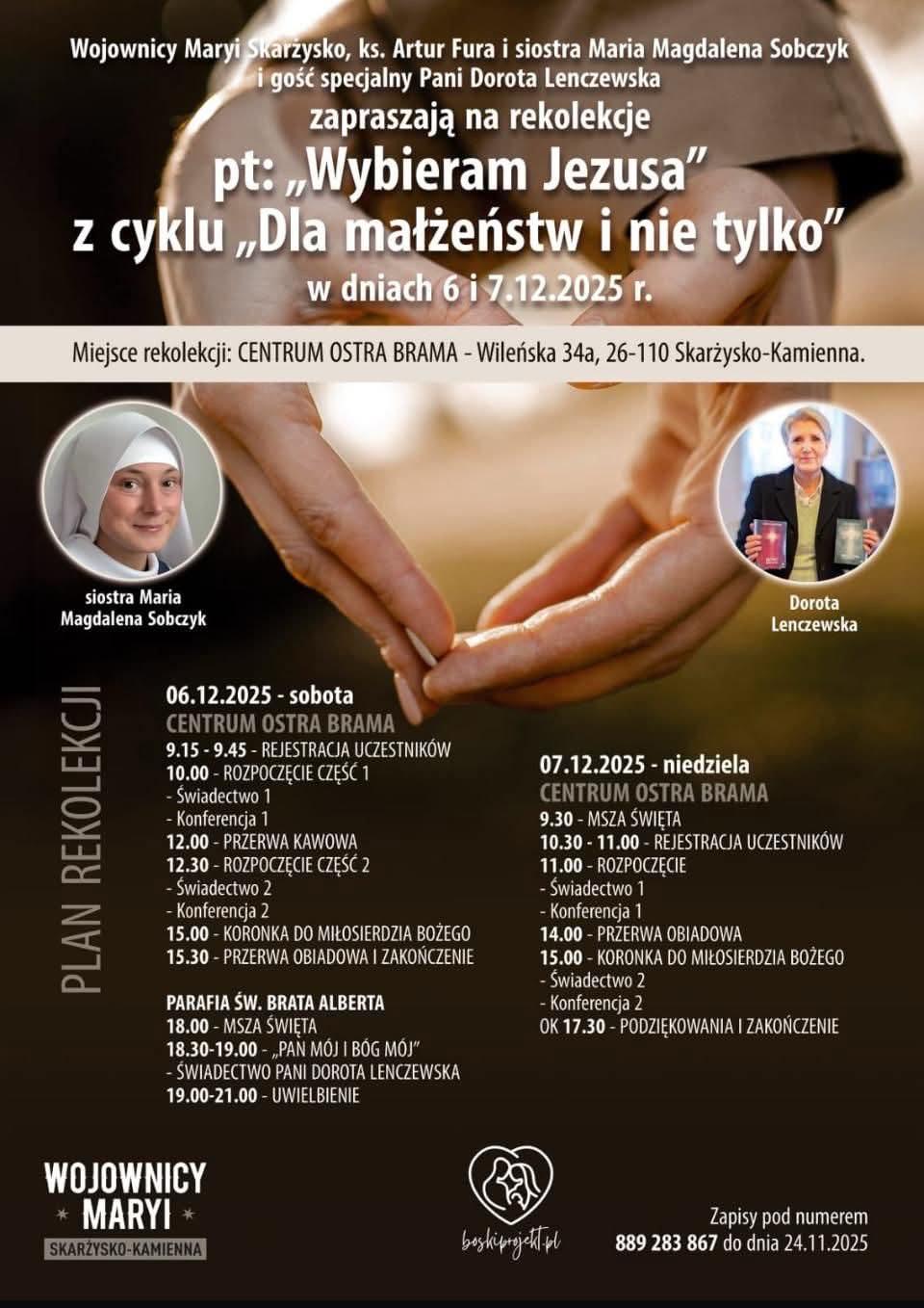 Wojownicy Maryi Skarżysko, ks. Artur Fura i Siostra Maria Magdalena Sobczyk i gość specjalny Pani Dorota Lenczewska zapraszają na rekolekcje: "Wybieram Jezusa" z cyklu "Dla małżeństw i nie tylko" w dniach: 6-7.12.2025r. Szczegóły na plakacie: